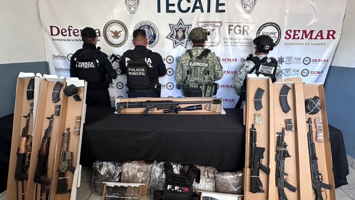Tecate, Baja California, a 13 de marzo de 2025.– Derivado de un reporte atendido en la calle Primera, colonia Tanamá, elementos de la Dirección de Seguridad Ciudadana y Tránsito Municipal, a través del Departamento de Operaciones Policiales, en coordinación con DEFENSA, Guardia Nacional y la Fuerza Estatal de Seguridad Ciudadana, lograron el aseguramiento de armamento, municiones, equipo táctico y un vehículo con reporte de robo.