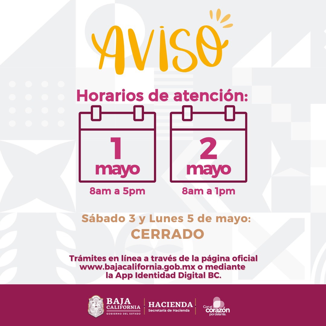 El Servicio de Administración Tributaria de Baja California (SAT BC) informa que el próximo jueves 1 y viernes 2 de mayo las oficinas de recaudación de rentas y módulos del Repuve estarán brindando atención en trámites vehiculares.