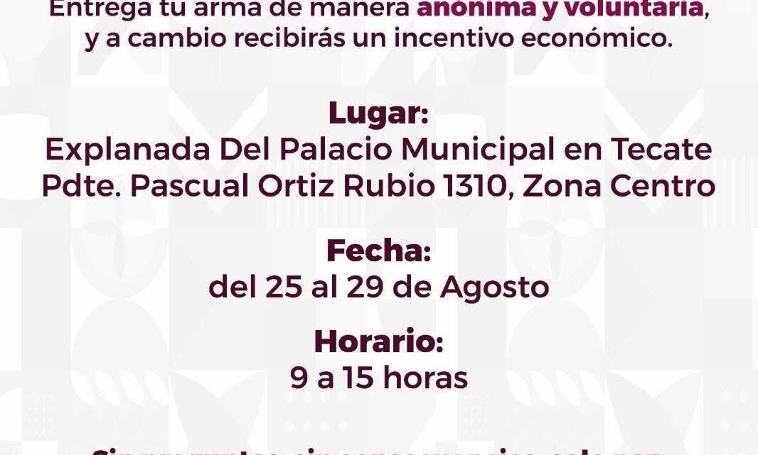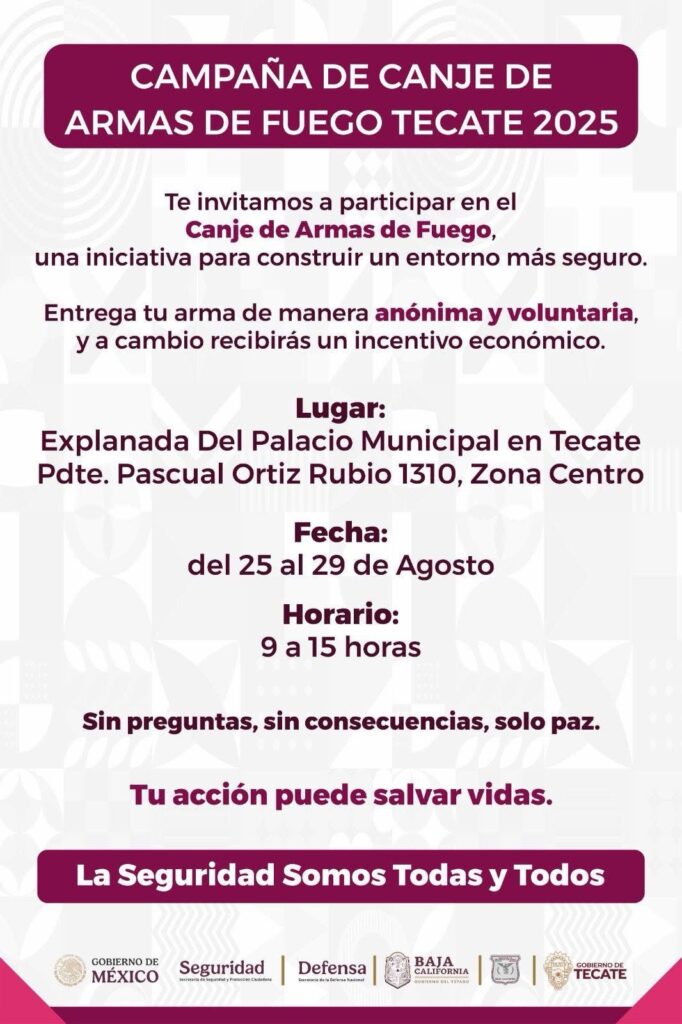 El Gobierno de Tecate reitera que este programa es un esfuerzo conjunto de los tres órdenes de gobierno enfocado en la prevención de la violencia y en la promoción de la paz social. Se cuenta con las medidas de seguridad necesarias para garantizar la confianza de la ciudadanía que acude responsablemente a entregar un arma de fuego.