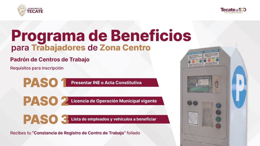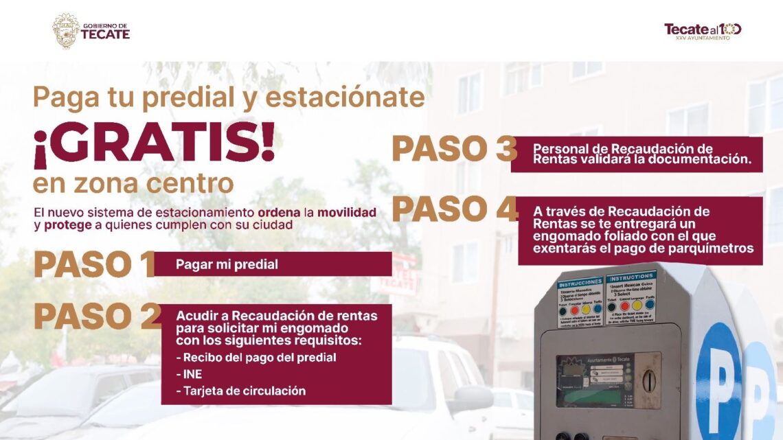Durante el anuncio, el Presidente Municipal informó que a partir de este viernes 13 de febrero comenzará la recepción de solicitudes para la entrega de engomados dirigidos a residentes de Tecate que se encuentren al corriente en el pago del impuesto predial. Este beneficio contempla la exención del 100% en el pago de parquímetros para un vehículo por contribuyente, siempre que cumpla con los requisitos establecidos.