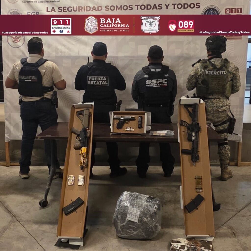 TECATE.- Durante un despliegue operativo implementado en zonas rurales del poblado Luis Echeverrɨa, en el municipio de Tecate, agentes de la Fuerza Estatal de Seguridad Ciudadana (FESC) aseguraron armas de fuego, cartuchos, chalecos balísticos y un vehículo que contaba con reporte de robo vigente en Estados Unidos.