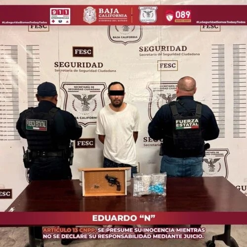 Tecate, Baja California.- Agentes de la Fuerza Estatal de Seguridad Ciudadana (FESC) detuvieron en el municipio de Tecate a un hombre quien se encontraba en posesión de un arma de fuego abastecida, así como varias dosis de metanfetamina.