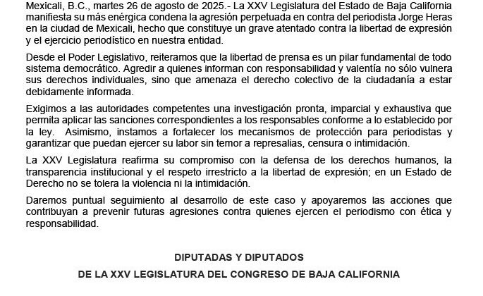Mexicali, B.C., martes 26 de agosto de 2025.- La XXV Legislatura del Estado de Baja California manifiesta su más enérgica condena ante la agresión sufrida …