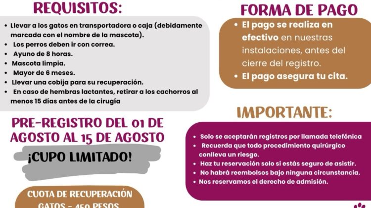 -La Campaña de Esterilización para Caninos y Felinos se llevará a cabo el 28 de septiembre en el Salón Social de la Delegación Luis Echeverría …