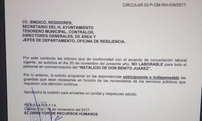 El director de recursos humanos, Héctor Luna Ortíz, informó mediante una carta que, en el ayuntamiento de Colima, no habrá actividades el próximo 20 de …
