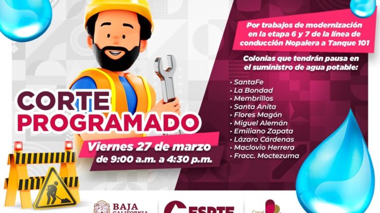 * Pausará el suministro de agua potable de 10 colonias de Tecate. TECATE.- La Comisión Estatal de Servicios Públicos de Tecate (CESPTE) informa a la …