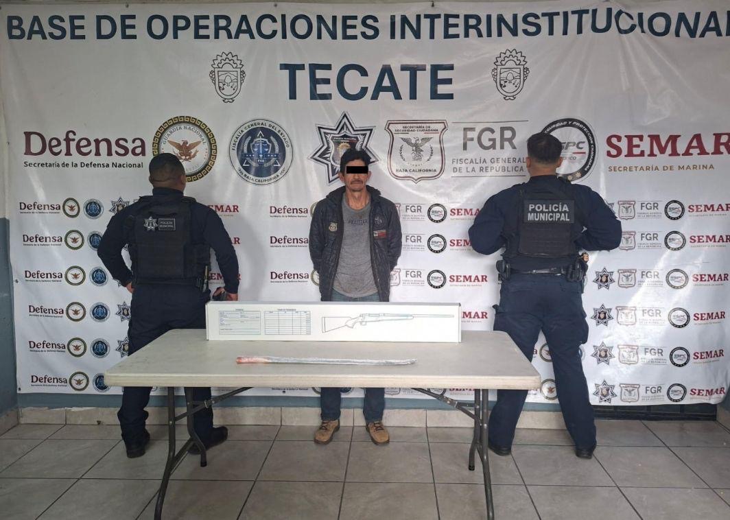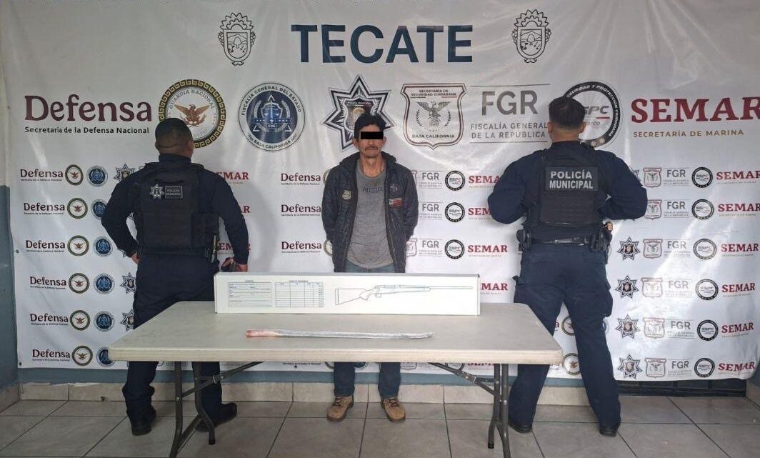 Tecate, Baja California, a 28 de abril de 2026.– Un masculino fue detenido por elementos de la Dirección de Seguridad Ciudadana y Tránsito Municipal de Tecate, luego de ser señalado por agresiones, daños, amenazas y portación de arma prohibida en el poblado Valle de las Palmas.