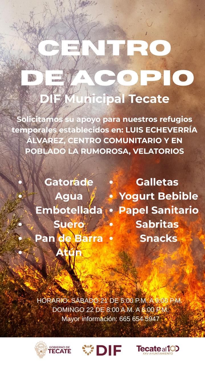 Tecate, Baja California a 21 de junio de 2025. — Ante la emergencia derivada de los incendios forestales que afectan a diversas comunidades del municipio, el DIF Municipal de Tecate ha habilitado un Centro de Acopio con el fin de reunir insumos básicos para los refugios temporales instalados en las delegaciones de Luis Echeverría Álvarez (El Hongo), Centro Comunitario y en Poblado La Rumorosa (Velatorios).