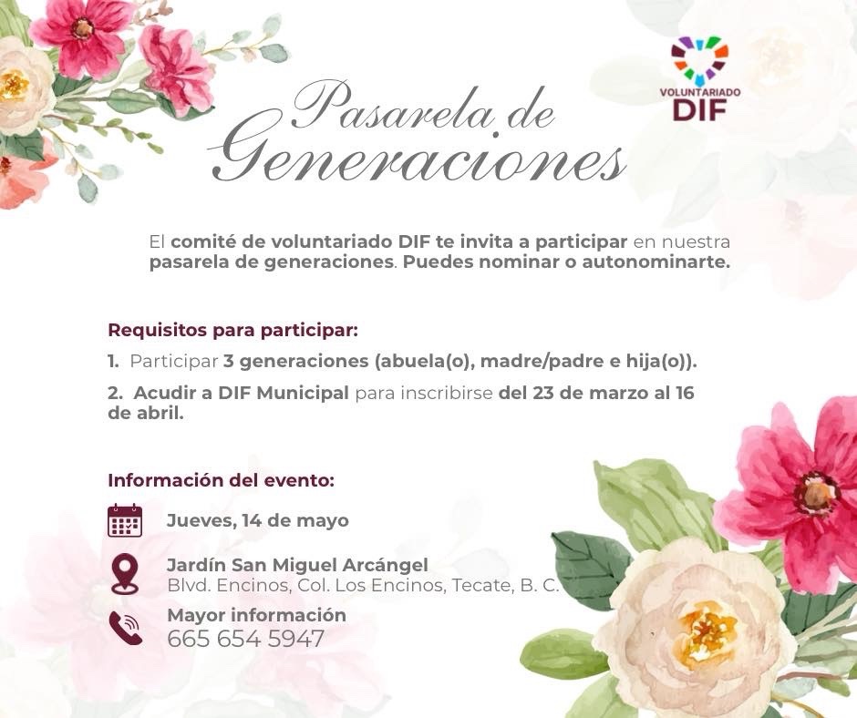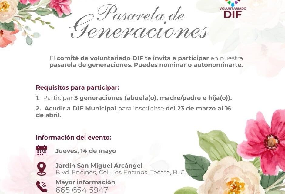Tecate, Baja California a 23 de marzo de 2026.– Con el objetivo de promover la integración familiar y reconocer el valor de cada etapa de la vida, el Sistema para el Desarrollo Integral de la Familia (DIF) Tecate, a través de su voluntariado, invita a la comunidad a participar en la “Pasarela de Generaciones”, un evento que busca celebrar los lazos que unen a las familias tecatenses.