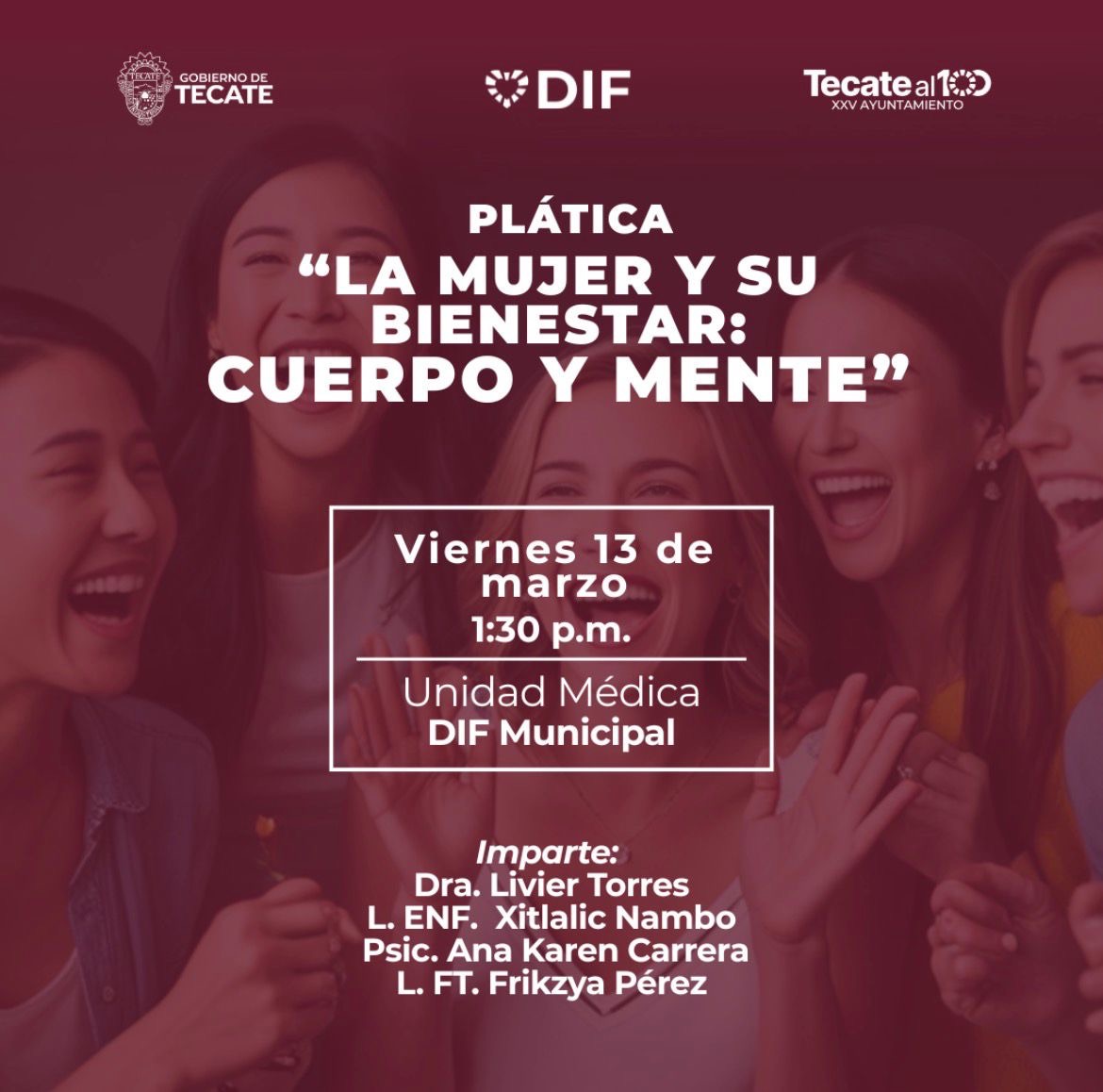 La actividad se llevará a cabo el viernes 13 de marzo a la 1:30 de la tarde en la Unidad Médica de DIF Municipal Tecate, donde especialistas en el área de la salud compartirán herramientas y conocimientos orientados al cuidado del cuerpo, la salud emocional y el bienestar mental de las mujeres.