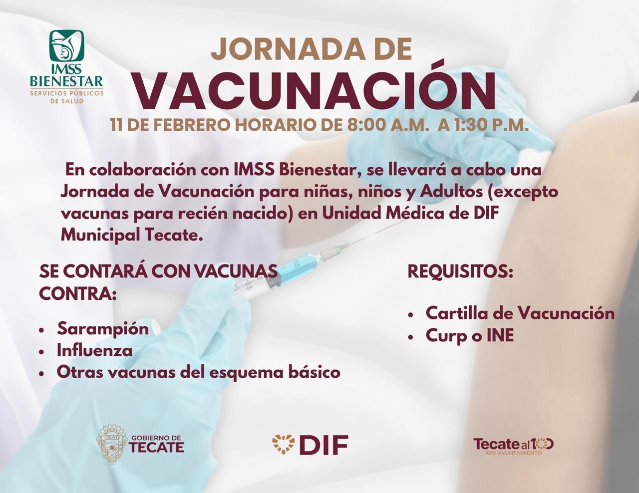 Tecate, Baja California.– Con el firme compromiso de proteger la salud de las familias tecatenses y fortalecer la prevención de enfermedades, el Sistema para el Desarrollo Integral de la Familia (DIF) Tecate, en colaboración con IMSS Bienestar, llevará a cabo una Jornada de Vacunación este 11 de febrero, en un horario de 8:00 de la mañana a 1:30 de la tarde, en la Unidad Médica del DIF Municipal.