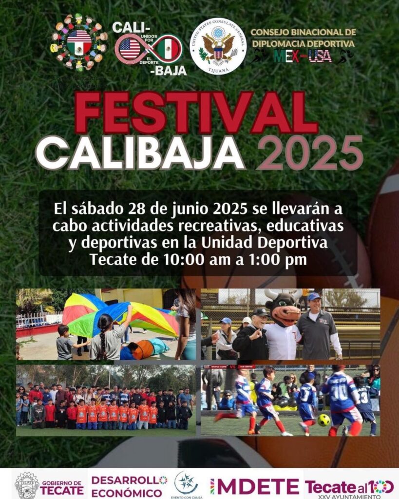 Tecate, Baja California a 24 de junio de 2025.– El Gobierno de Tecate, a través del Instituto Municipal del Deporte (IMDETE), en coordinación con la Dirección de Desarrollo Económico, el Consejo Binacional de Diplomacia Deportiva MEX-USA y el Consulado General de Estados Unidos en Tijuana, invita a la ciudadanía a participar en el Festival Calibaja 2025, un evento binacional que celebra la unión entre México y Estados Unidos a través del deporte, la inclusión y la comunidad.