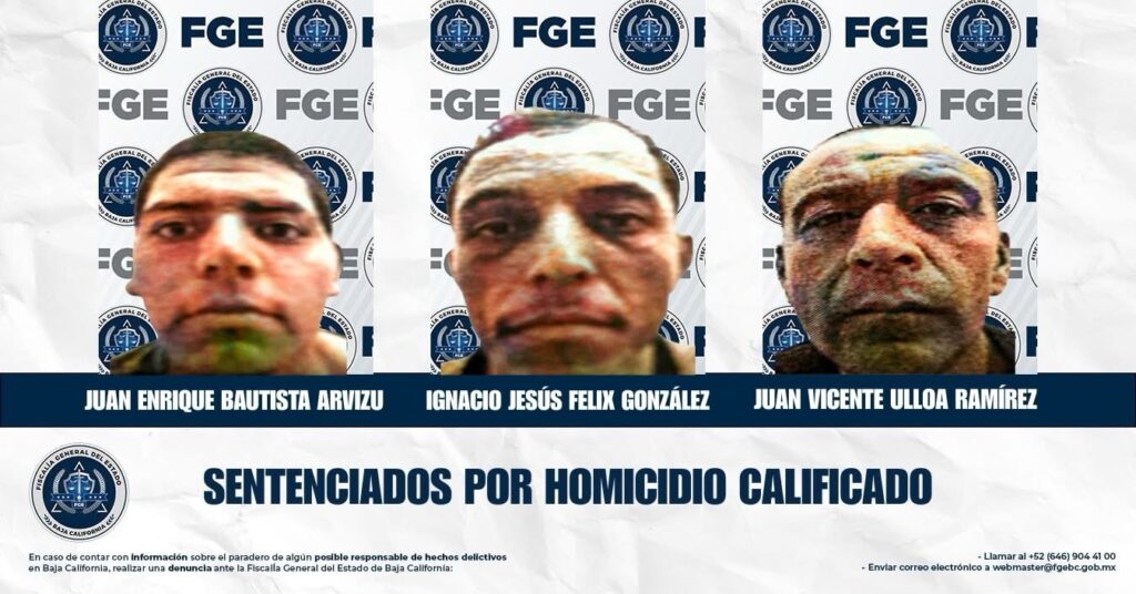 TIJUANA, BAJA CALIFORNIA. – La Fiscalía General del Estado, a través de la Coordinación de Averiguaciones Previas y Control de Procesos, informa que, como resultado de un trabajo integral de investigación y la presentación de pruebas contundentes, se obtuvieron tres sentencias condenatorias por el delito de homicidio calificado en contra de Juan Enrique Bautista Arvizú, alias “El Gordo”; Ignacio Jesús Félix González, quien también utilizaba su nombre invertido y el alias “El Chuy”; y Juan Vicente Ulloa Ramírez, quien se hacía pasar por Gregorio Díaz Castañeda, alias “El Papis”. Cada uno de los sentenciados fue condenado a 30 años de prisión, así como al pago de la reparación del daño y una indemnización a favor de las víctimas. Además, el tribunal resolvió negar cualquier beneficio libertario.