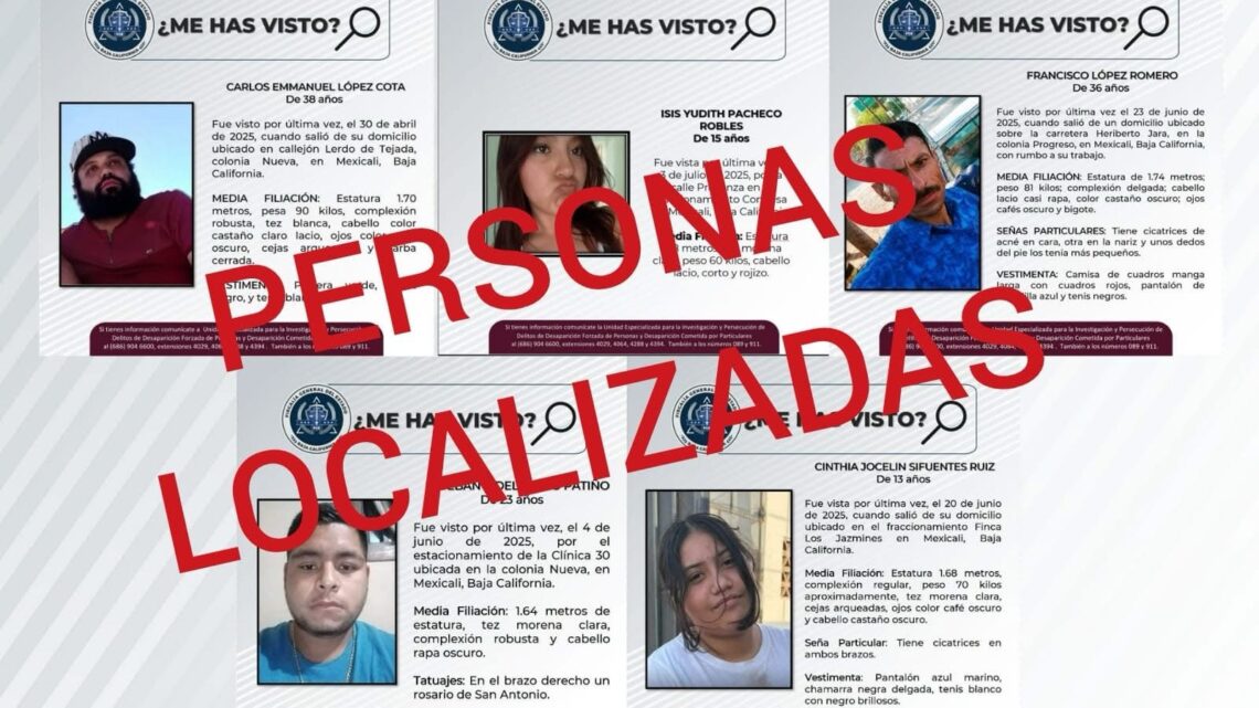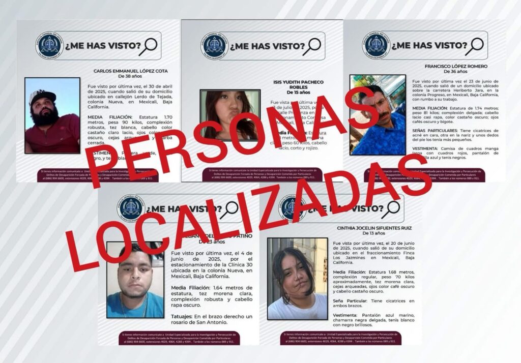 MEXICALI, BAJA CALIFORNIA. –  La Fiscalía General del Estado de Baja California, a través de la Unidad Especializada para la Investigación y Persecución de Delitos de Desaparición Forzada y Desaparición Cometida por Particulares, logró la localización de cinco personas que contaban con reporte de búsqueda.