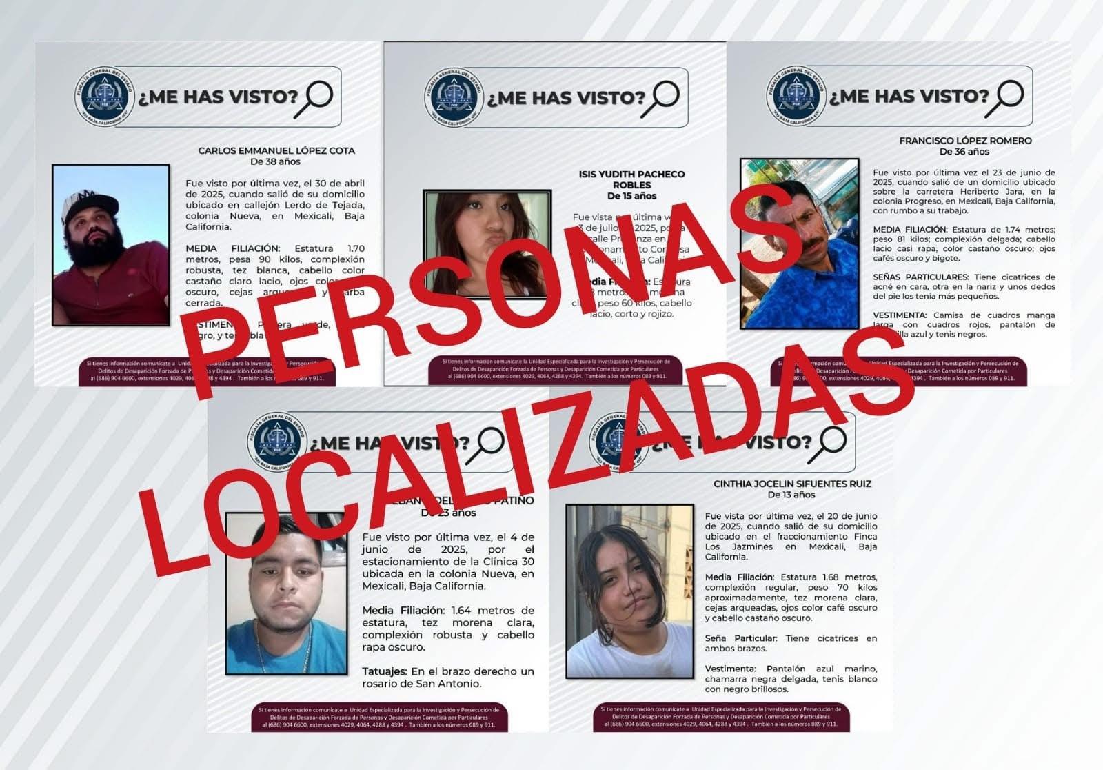 Por lo anterior, se cancelan las pesquisas emitidas para la localización de Esteban Fidel Rubio Patino de 26 años; Francisco López Romero de 36 años; Carlos Emmanuel Cota de 37 años si como las menores Isis Yudith Pacheco y Cinthia Jocelin Sifuente Ruiz de 15 y 13 años, respectivamente.