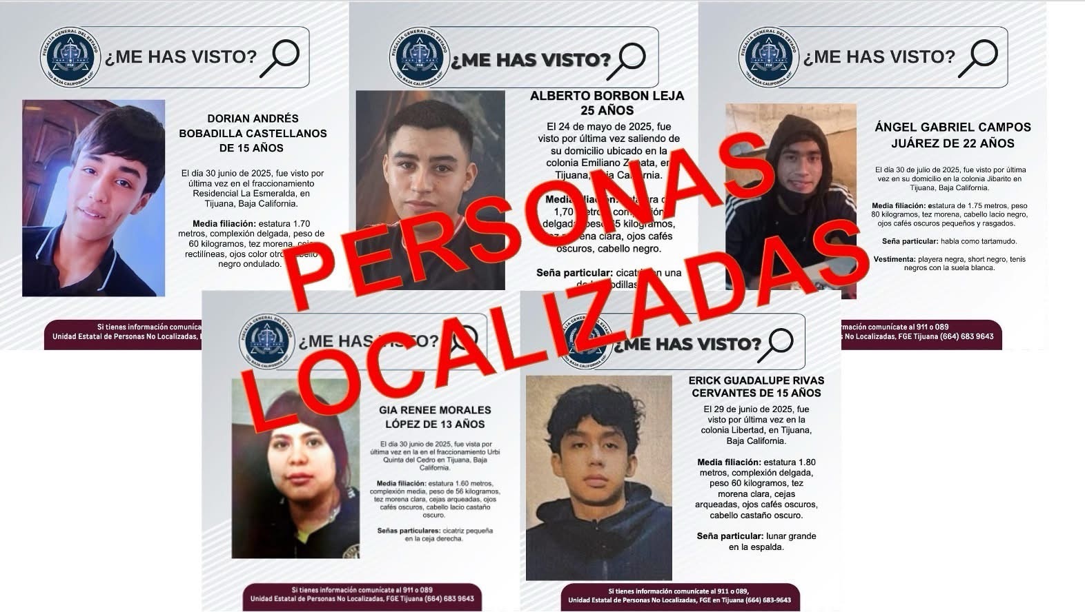 TIJUANA, BAJA CALIFORNIA. – La Fiscalía General del Estado (FGE) informa la localización de cinco personas que habían sido reportadas como desaparecidas, tres de ellas menores de edad. Este grupo localizado en diversas acciones, compuesto por una mujeres y cuatro hombres, estaba en condiciones óptimas de salud.