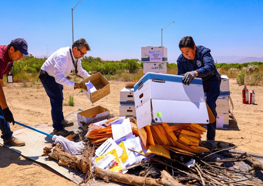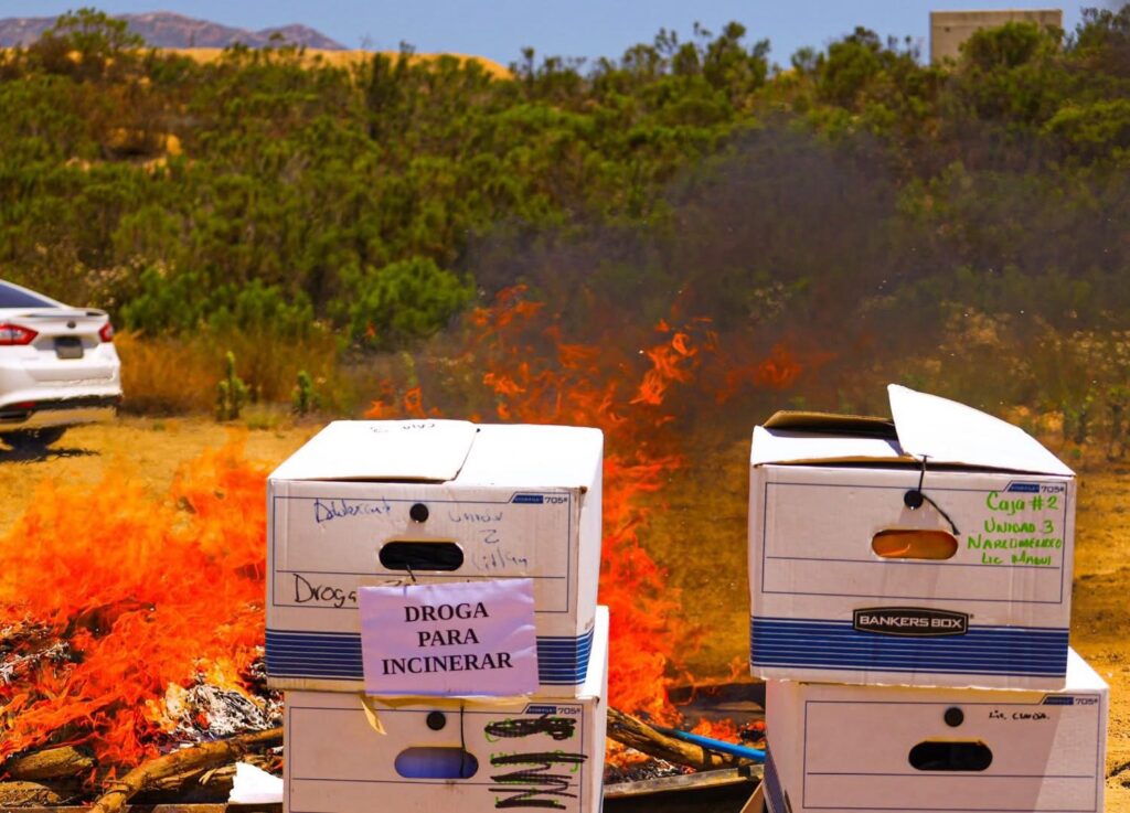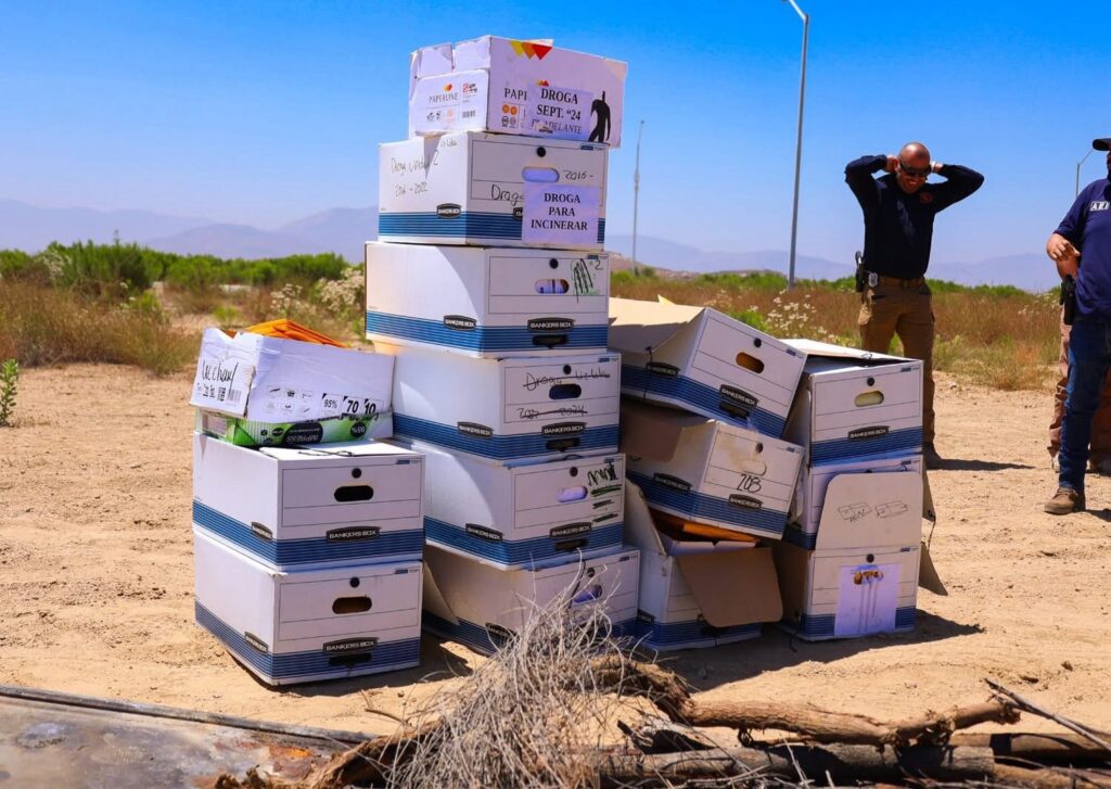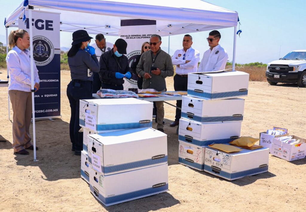Tecate, B.C. – Con el firme compromiso de continuar el combate frontal a la delincuencia y al narcomenudeo, la Fiscalía General del Estado de Baja California (FGEBC), encabezada por la Dra. Ma. Elena Andrade Ramírez, llevó a cabo la diligencia de destrucción por incineración de narcóticos asegurados, como parte de las acciones constantes en materia de procuración de justicia y seguridad pública.