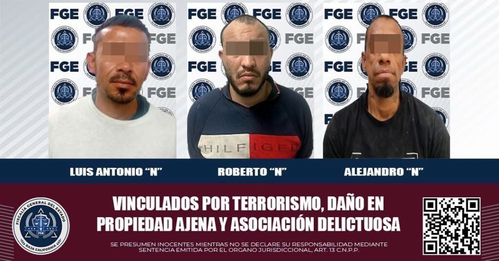 MEXICALI, BAJA CALIFORNIA. –  La Fiscalía Regional de Mexicali, a través de la Unidad de Investigación de Delitos Contra el Patrimonio, la Sociedad, el Estado y la Justicia, obtuvo la vinculación a proceso de tres personas por su presunta participación en los delitos de terrorismo, daño en propiedad ajena por incendio y asociación delictuosa.