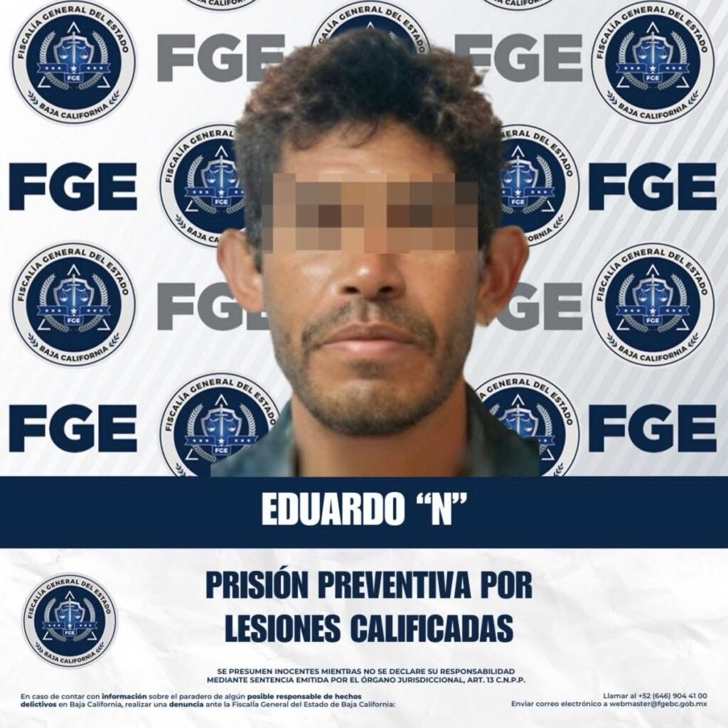 TECATE, BAJA CALIFORNIA, 16 DE JULIO DE 2025.- La Fiscalía Regional de Tecate, a través de la Unidad de Investigación Especializada en Delitos contra las Personas y su Libertad, informa que el día 7 de julio de 2025, el Juez de Control del Poder Judicial de Tecate dictó la medida cautelar de prisión preventiva justificada en contra de Eduardo “N”, imputado por el delito de lesiones calificadas.