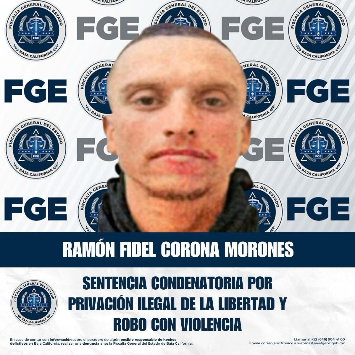 -Como resultado de las acciones emprendidas para combatir la impunidad en Baja California, la Fiscalía Regional de Tecate obtuvo una sentencia condenatoria en contra de Ramón Fidel Corona Morones por los delitos de privación de la libertad agravada, robo con violencia y robo de vehículo cometido con violencia.