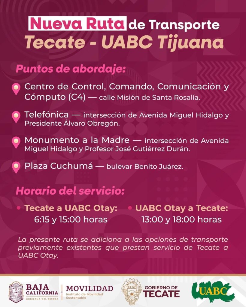 Tecate, Baja California, a 12 de agosto de 2025. – Con el firme compromiso de apoyar a las juventudes en su desarrollo académico, el Gobierno del Estado, a través del Instituto de Movilidad Sustentable (IMOS), pondrá en marcha el servicio de transporte escolar entre Tecate y el Campus Otay de la Universidad Autónoma de Baja California (UABC), en Tijuana, correspondiente al ciclo escolar 2025-2.