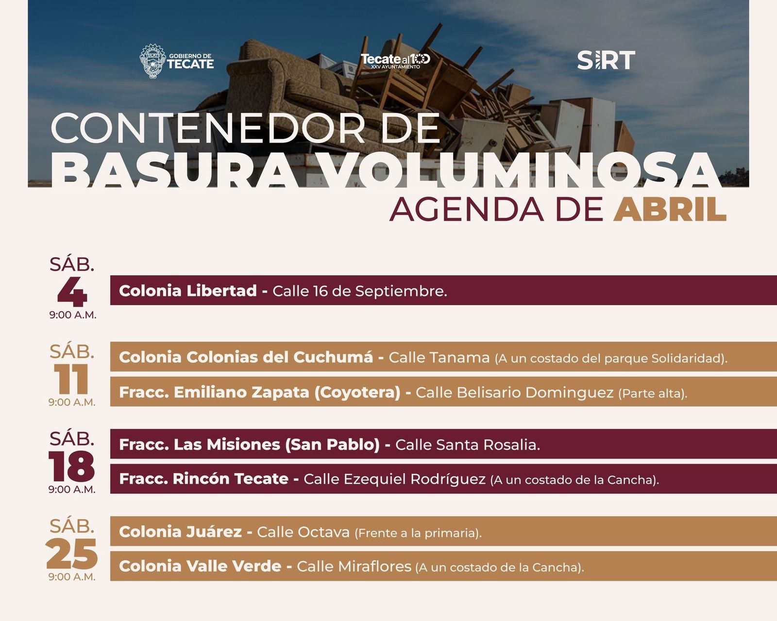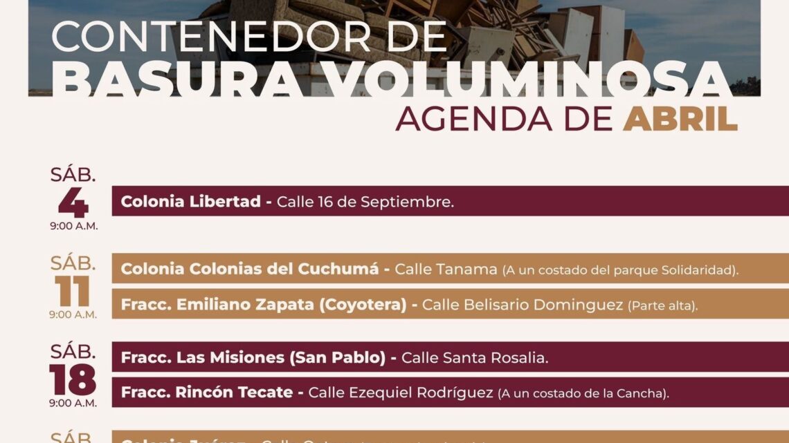 Tecate, Baja California.– Con el objetivo de promover entornos más limpios, ordenados y saludables para las familias tecatenses, el Gobierno de Tecate informa a la ciudadanía el calendario del mes de abril del programa “Contenedor de Basura Voluminosa”, mediante el cual se facilita la disposición adecuada de residuos de gran tamaño.
