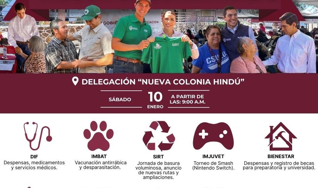 Tecate, Baja California a 27 de diciembre de 2025.- Con el objetivo de estar más cerca de la gente y atender directamente las necesidades de las familias, el Gobierno de Tecate invita a vecinas y vecinos de la Delegación Nueva Colonia Hindú a participar en la jornada “Gobierno en tu Delegación”, que se realizará el sábado 10 de enero, a partir de las 9:00 de la mañana.