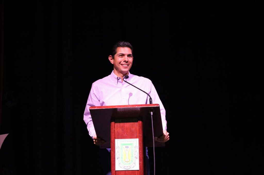 El alcalde subrayó que la función pública no debe entenderse como una dádiva, sino como una responsabilidad ética y transparente en el manejo de los recursos públicos, e invitó a las y los estudiantes a involucrarse activamente en la construcción de un “Tecate al 100”.
