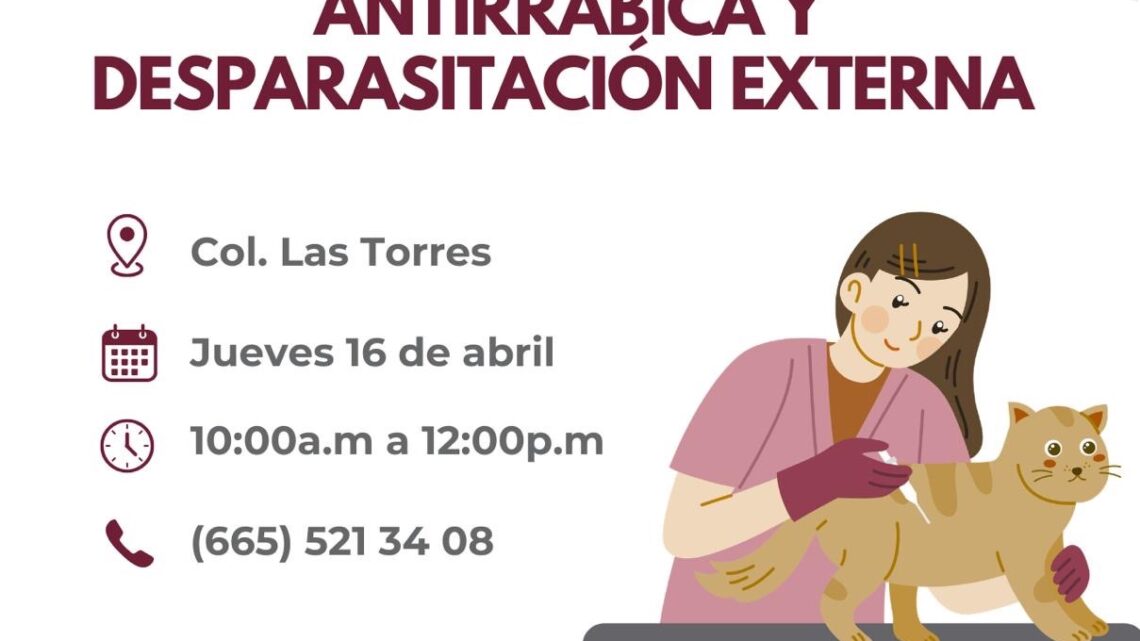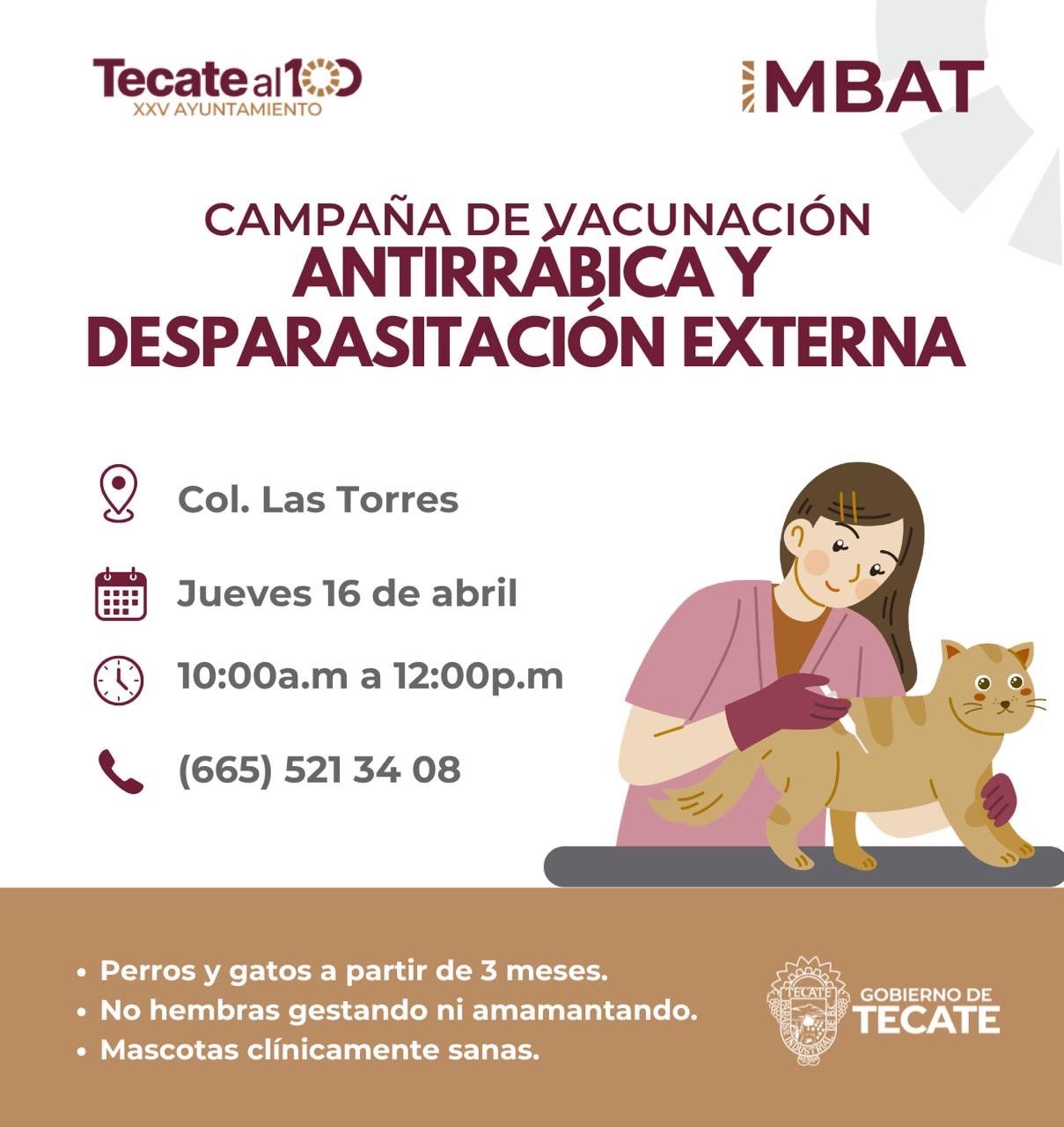 Tecate, Baja California a 15 de abril de 2026.– El Gobierno de Tecate, a través del Instituto Municipal de Bienestar Animal (IMBAT), recuerda a la ciudadanía que este jueves 16 de abril se llevará a cabo una jornada gratuita de vacunación antirrábica y desparasitación externa para perros y gatos en la colonia Las Torres.