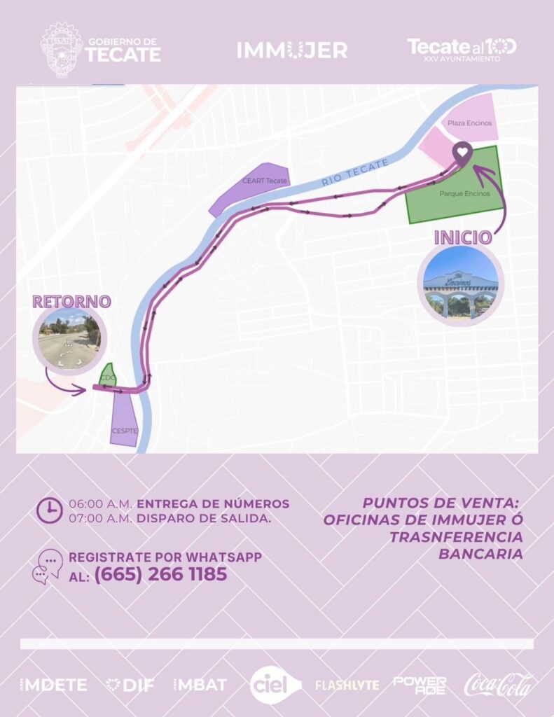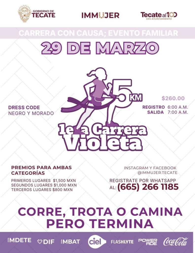 Tecate, Baja California a 23 de marzo de 2026.– El Gobierno de Tecate, a través del Instituto Municipal de la Mujer (IMMUJER), invita a la comunidad a sumarse a la Carrera Violeta 2026, que se llevará a cabo este domingo 29 de marzo en el Parque Los Encinos.