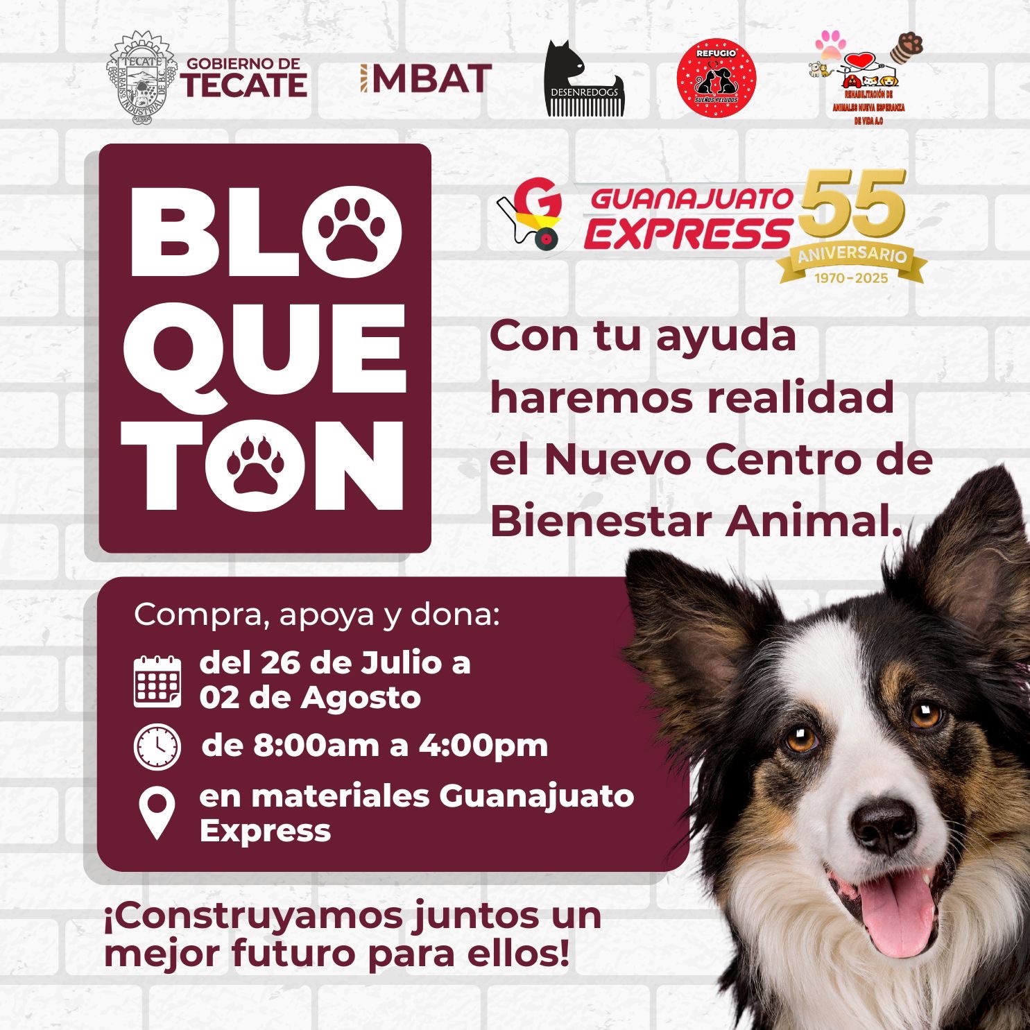 Tecate, Baja California a 1 de agosto de 2025.– El Gobierno de Tecate hace un llamado a la comunidad tecatense para unirse en las últimas horas del Bloquetón 2025, una noble campaña que busca reunir bloques para hacer realidad el sueño del nuevo Centro de Bienestar Animal del municipio.