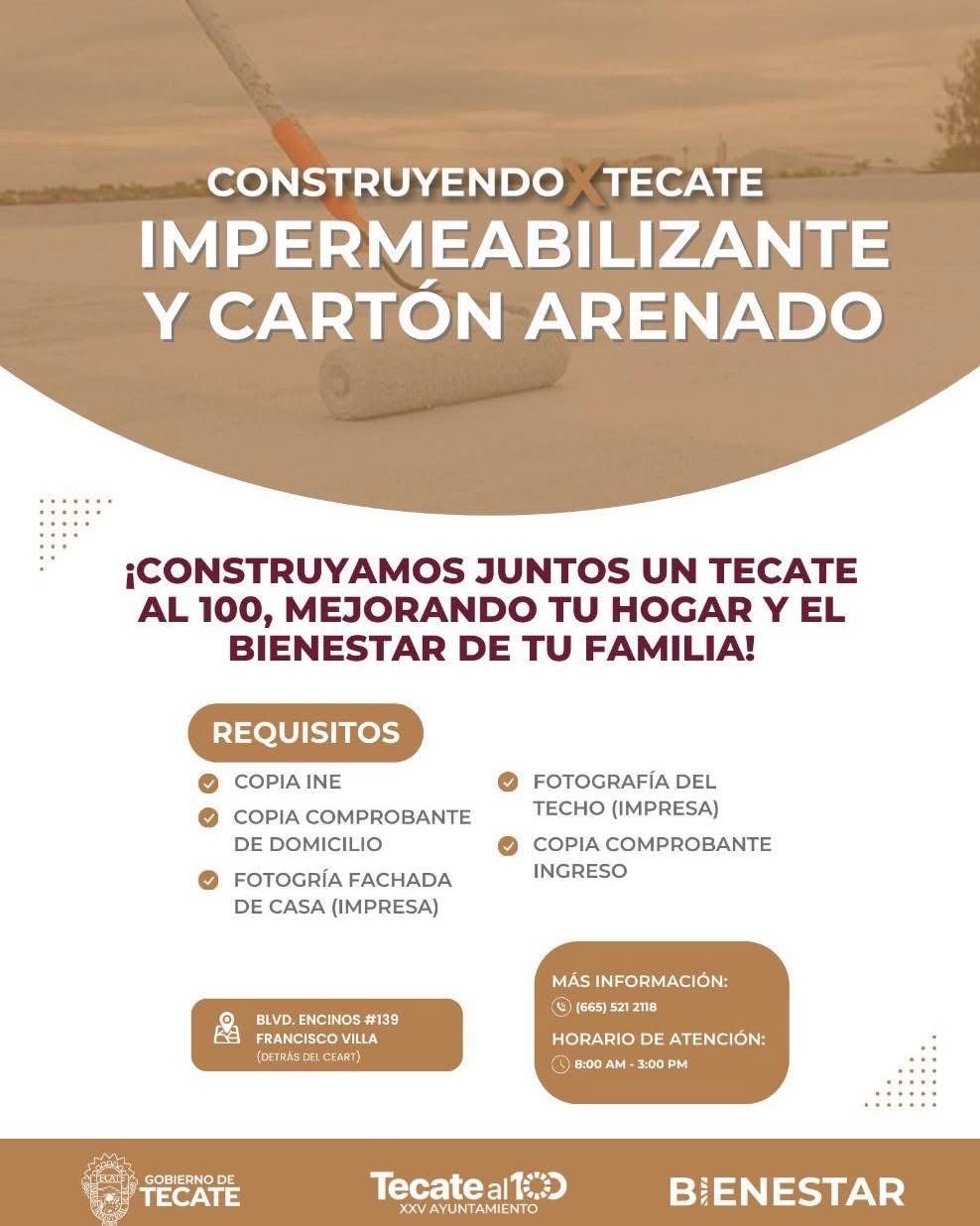 Tecate, Baja California, a 27 de octubre de 2025.– Con el objetivo de apoyar a las familias tecatenses en el cuidado y protección de sus hogares durante la temporada de clima extremo, el Gobierno de Tecate, a través de la Dirección de Bienestar Municipal, abrió la convocatoria del programa “Construyendo X Tecate”, mediante el cual se entregará impermeabilizante y cartón arenado a hogares que lo necesiten.