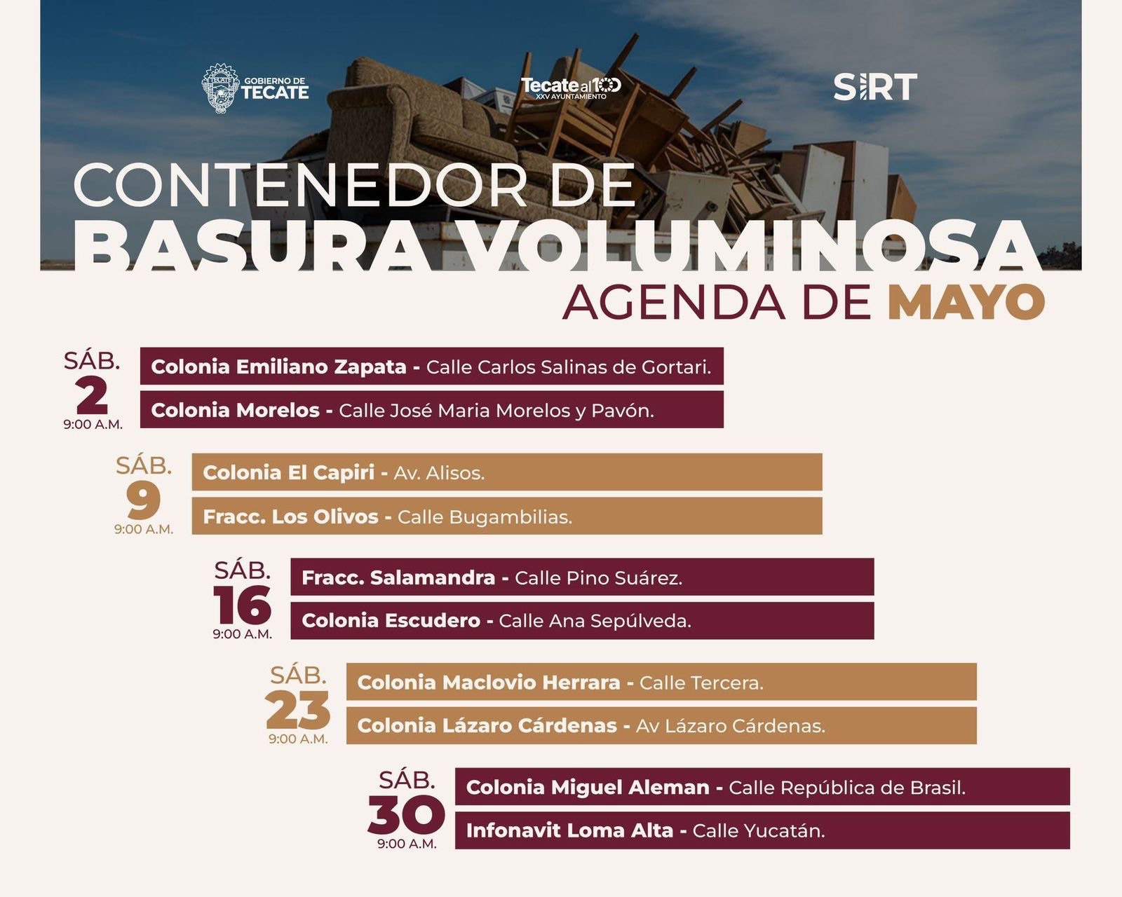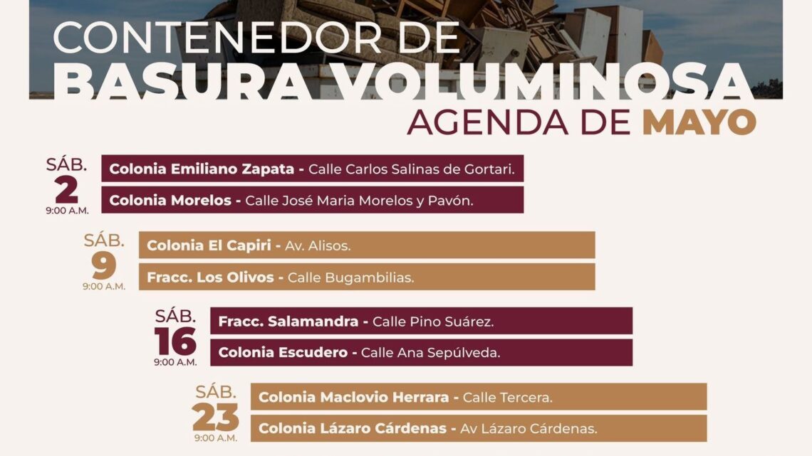 Tecate, Baja California a 30 de abril de 2026.– Con el objetivo de continuar fortaleciendo el orden, la limpieza y la calidad de vida en las colonias, el Gobierno de Tecate, a través del Sistema Integral de Residuos de Tecate (SIRT), dio a conocer la agenda correspondiente al mes de mayo de las jornadas de contenedores de basura voluminosa.