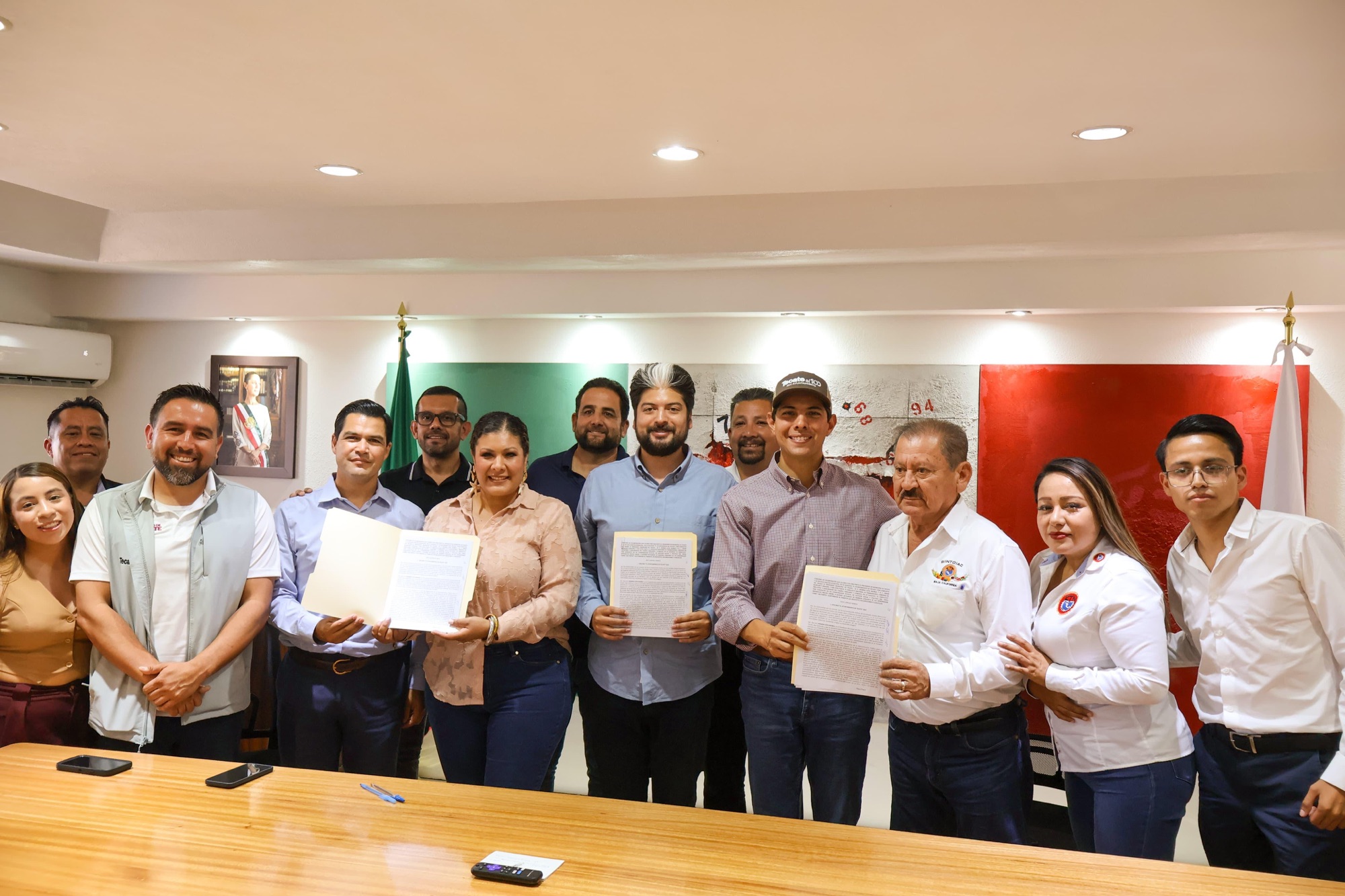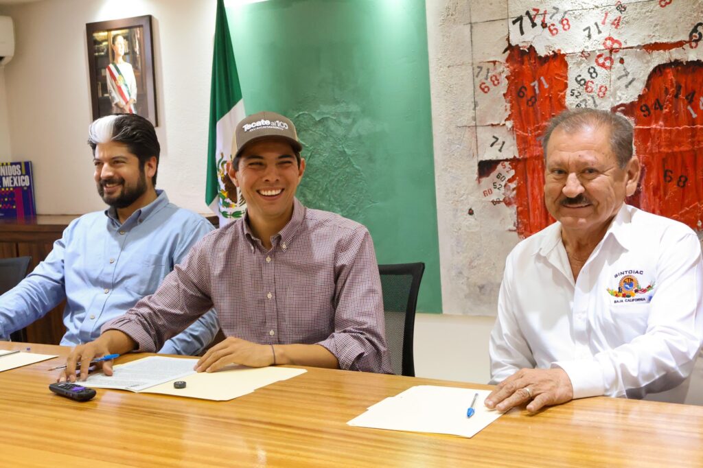 Tecate, Baja California a 18 de junio de 2025.– Con el firme propósito de seguir mejorando las condiciones de vida de las familias tecatenses, el Gobierno de Tecate firmó un importante convenio de colaboración con el Sindicato Nacional de Trabajadores, Obreros de Industria y Asalariados del Campo, Similares y Conexos (SINTOIAC), y la empresa COMEX, con el objetivo de sumar esfuerzos para llevar programas sociales, apoyos comunitarios y acciones de recuperación de espacios a todas las zonas del municipio.