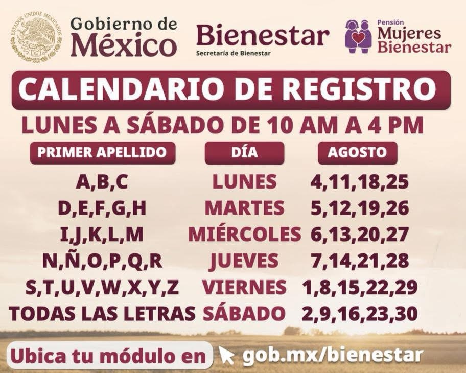 El registro a la Pensión de Mujeres Bienestar estará abierto de 1 al 30 de agosto, de lunes a sábado, con un horario de las 10:00 a 16:00 horas, en los módulos habilitados por la Secretaría de Bienestar.