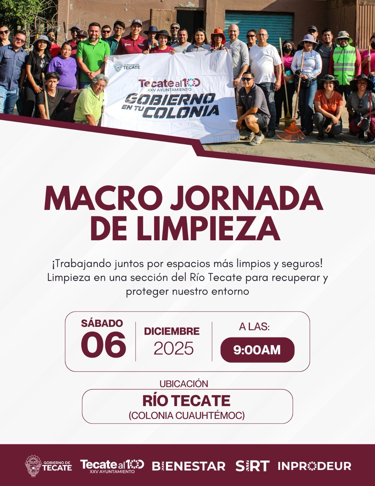 Tecate, Baja California a 27 de noviembre de 2025.- Con el firme compromiso de recuperar, proteger y dignificar los espacios públicos de nuestra ciudad, el Gobierno de Tecate, a través de la Dirección de Bienestar, SIRT e INPRODEUR, convoca a todas y todos los tecatenses a sumarse a la Macro Jornada de Limpieza que se llevará a cabo el próximo sábado 06 de diciembre de 2025 a las 9:00 a.m., en una sección del Río Tecate, ubicada en la colonia Cuauhtémoc.