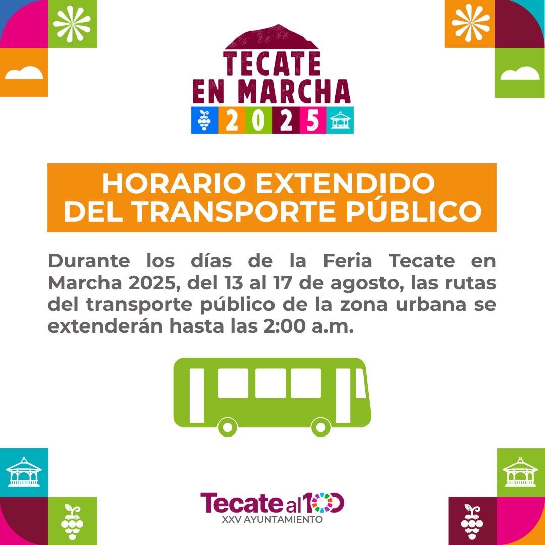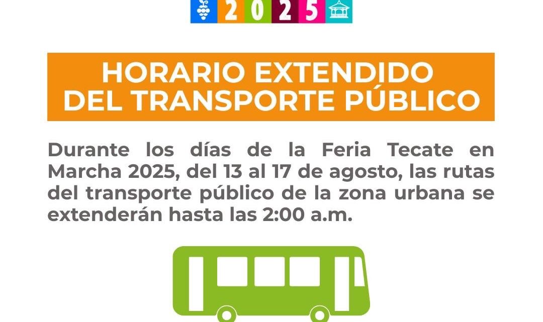 Tecate, Baja California, a 12 de agosto de 2025. – Pensando en el bienestar y comodidad de las familias tecatenses y de quienes visitan el municipio, el Gobierno de Tecate implementará un horario especial de transporte público durante la Feria Tecate en Marcha 2025, del 13 al 17 de agosto, para que nadie se quede sin disfrutar de esta gran celebración.