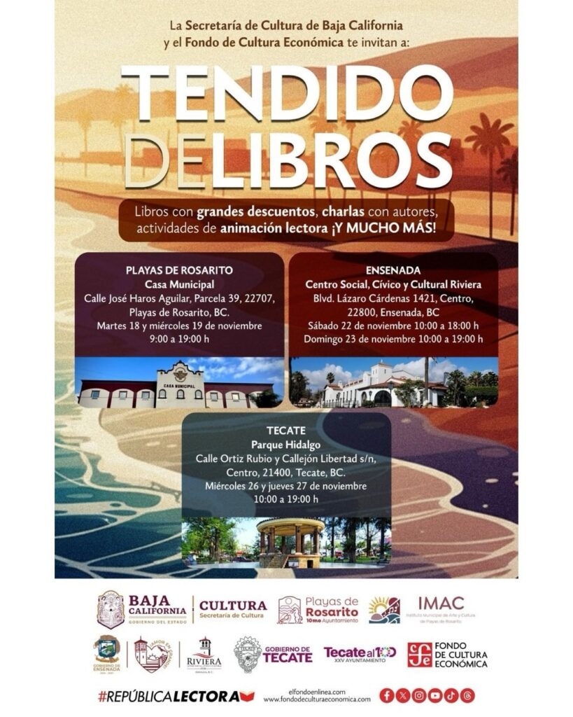 Tecate, Baja California a 04 de noviembre de 2025.– El Instituto Municipal de Arte y Cultura de Tecate (IMACTE) invita a la comunidad a disfrutar del Tendido de Libros, un evento literario que llega a nuestro municipio gracias a la Secretaría de Cultura de Baja California y el Fondo de Cultura Económica.