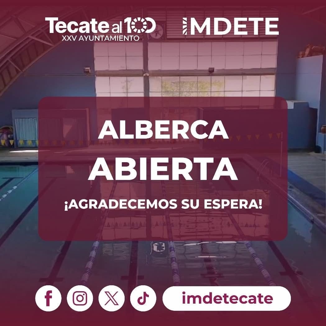 Tecate, Baja California a 04 de noviembre de 2025.– El Instituto Municipal del Deporte de Tecate (IMDETE) informa a la comunidad que la alberca de la Unidad Deportiva Eufrasio Santana se encuentra nuevamente abierta al público, luego de haberse realizado trabajos de reparación en el cableado eléctrico.