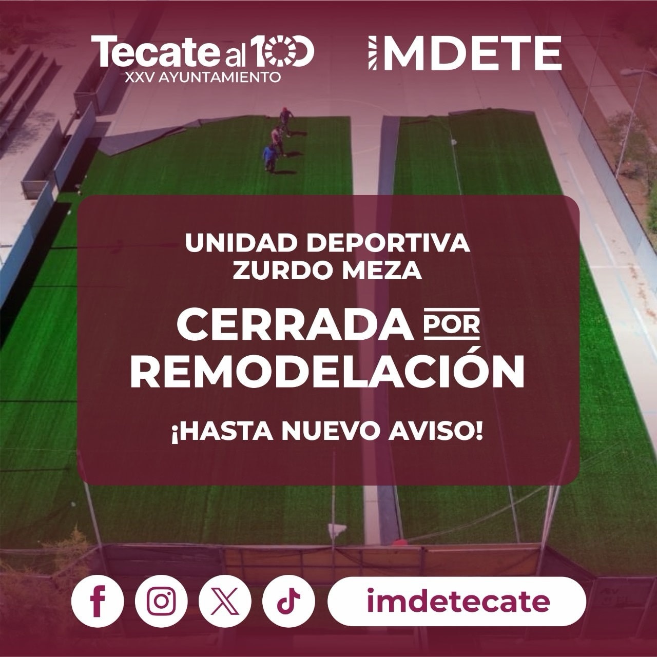 Tecate, B.C., a 26 de agosto de 2025.- El Instituto Municipal del Deporte de Tecate (IMDETE) informa a la comunidad que la Unidad Deportiva Zurdo Meza, ubicada en la colonia Ampliación Descanso, permanecerá cerrada temporalmente debido a un programa de remodelación integral que busca renovar y modernizar sus espacios para beneficio de las y los deportistas tecatenses.