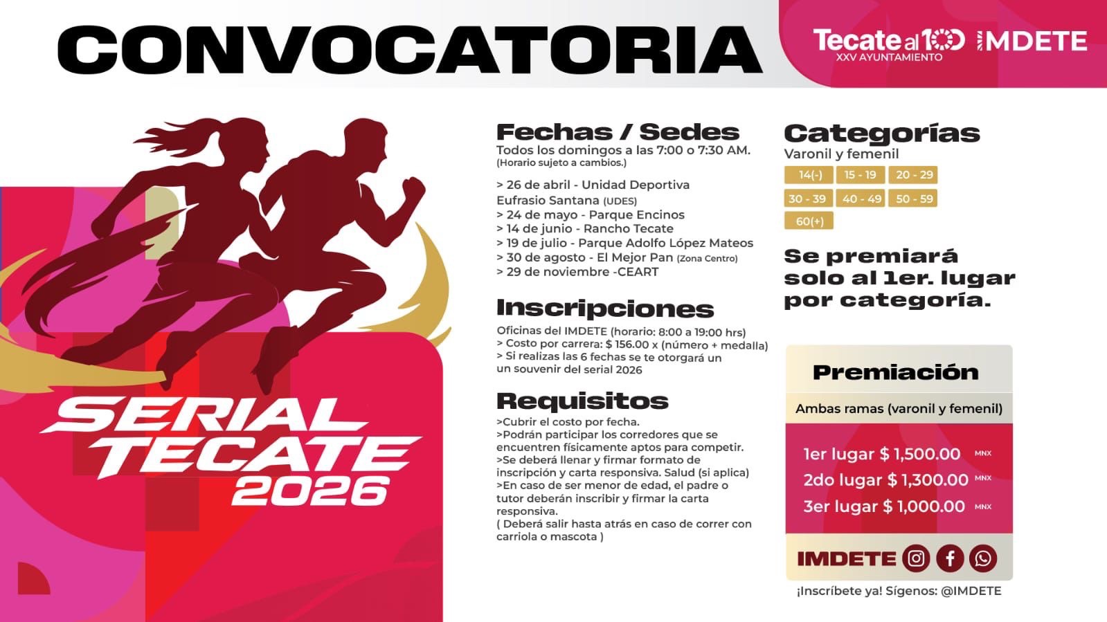 Para más información sobre inscripciones, categorías y detalles de cada carrera, se invita a la ciudadanía a consultar las redes sociales oficiales de IMDETE.