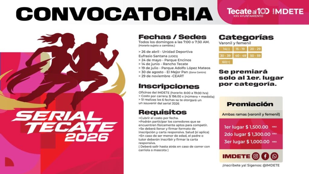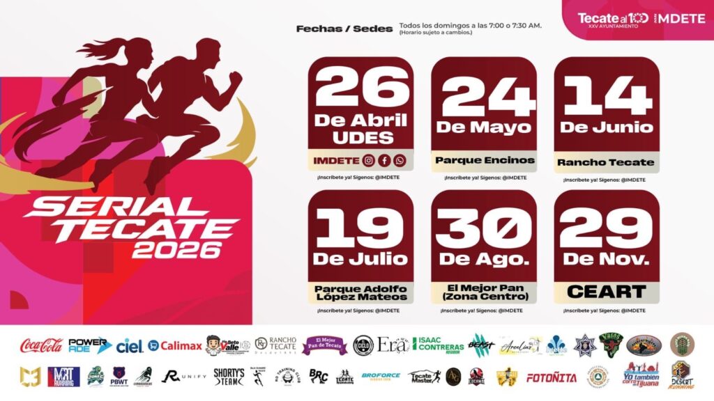 Tecate, B.C. a 09 de abril de 2026 – Con el objetivo de fomentar la activación física, la convivencia familiar y el uso de los espacios públicos, el Instituto Municipal del Deporte de Tecate (IMDETE) anunció el arranque del Serial Atlético 2026, una serie de carreras que recorrerán distintos puntos emblemáticos del municipio a lo largo del año.