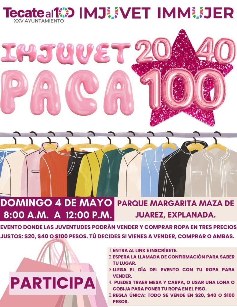 Tecate, Baja California, abril de 2025 — En un esfuerzo por fortalecer la economía solidaria y brindar espacios de participación activa para las juventudes, el Instituto Municipal de la Juventud (IMJUVET), en coordinación con el Instituto Municipal de la Mujer (IMMUJER) de Tecate, llevarán a cabo la iniciativa “PACA 100”, un evento pensado para que las y los jóvenes puedan vender o adquirir ropa a precios justos y accesibles.