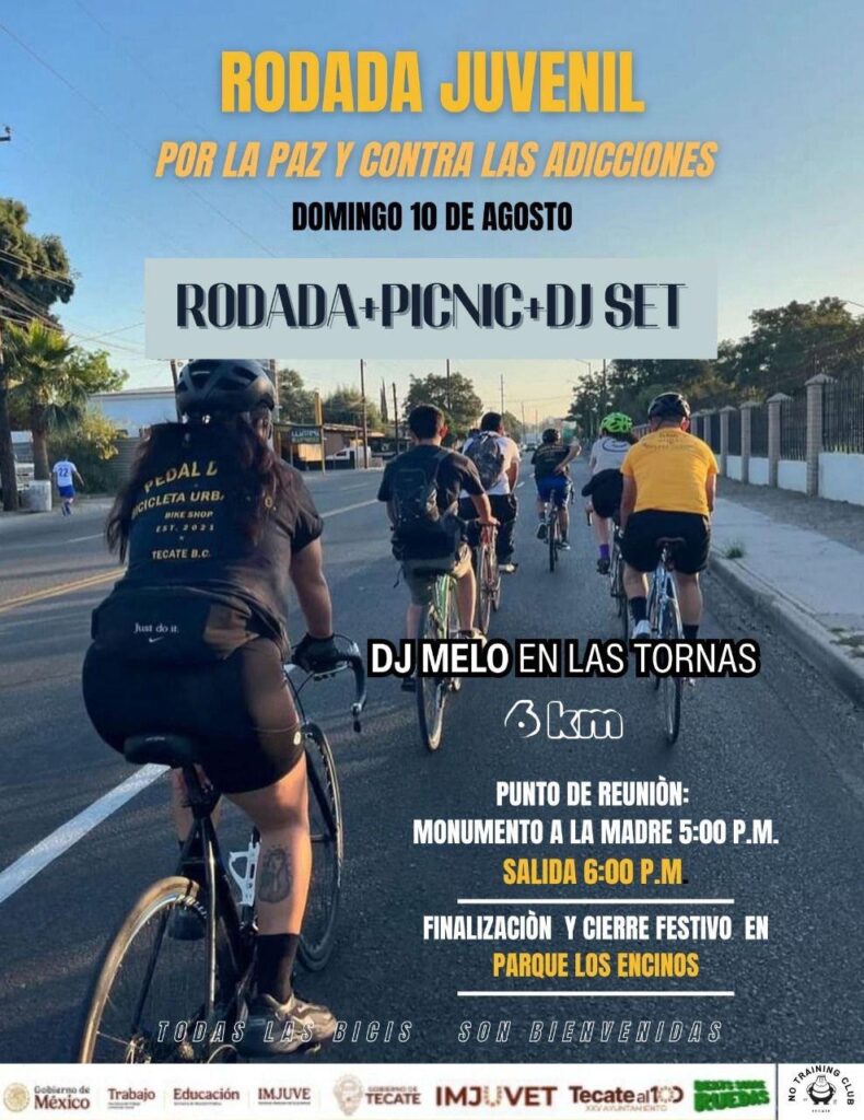 Tecate, Baja California a 06 de agosto de 2025.– Para impulsar entornos de sana convivencia y promover estilos de vida saludables entre las juventudes, el Instituto Municipal de la Juventud de Tecate (IMJUVET), en coordinación con el Gobierno de México, invitan a las juventudes a participar en la Rodada Juvenil por la Paz y Contra las Adicciones, es este domingo 10 de agosto, en punto de las 5:00 PM en el Monumento a la Madre.