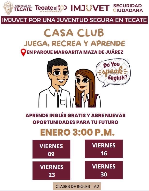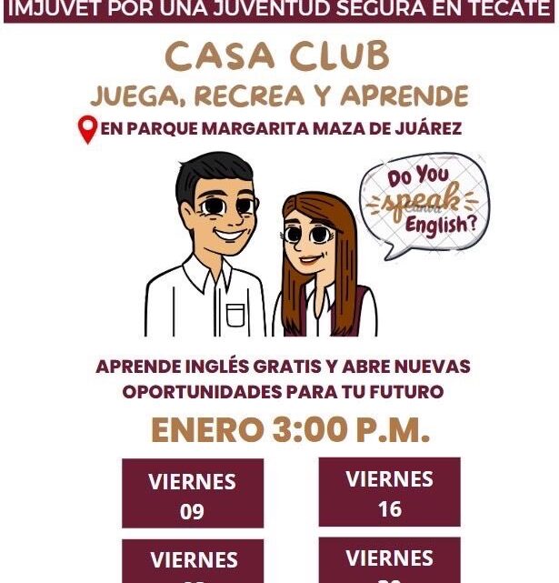Tecate, B.C. a 11 de enero de 2026. – Con el objetivo de fortalecer el desarrollo personal y profesional de las juventudes, el Instituto Municipal de la Juventud de Tecate (IMJUVET) invita a participar en las clases gratuitas de inglés que se impartirán en la Casa Club “Juega, Recrea y Aprende”, ubicada en el Parque Margarita Maza de Juárez, en la colonia Juárez.