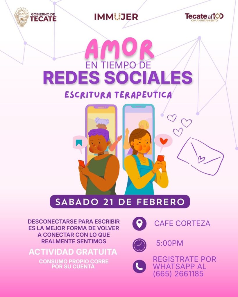 Tecate, Baja California, 20 de febrero de 2026.- Con el propósito de generar espacios de reflexión y bienestar emocional, el Gobierno de Tecate, a través del Instituto Municipal de la Mujer (IMMUJER), invita a la comunidad a participar en la actividad “Amor en Tiempo de Redes Sociales: Escritura Terapéutica”, una experiencia diseñada para promover la conexión personal y el manejo saludable de las emociones en la era digital.