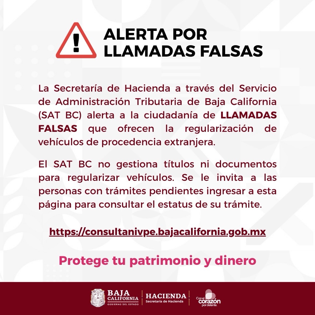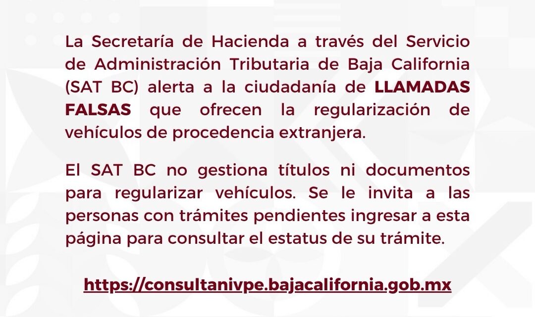 En este sentido el SAT BC exhorta a la ciudadanía a no caer en falsas llamadas y gestores que ofrecen regularizar sus vehículos extranjeros, y proteger su patrimonio bajo estos esquemas irregulares.