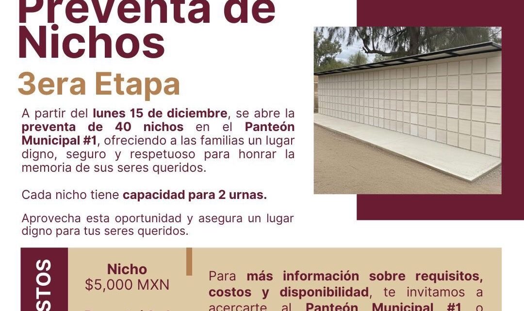 Tecate, B.C. a 15 de diciembre de 2025.— El Gobierno de Tecate informa a la ciudadanía que, a partir de este lunes 15 de diciembre, se encuentra abierta la preventa de la tercera etapa de nichos en el Panteón Municipal #1, con un total de 40 espacios disponibles, como parte del compromiso por brindar a las familias tecatenses alternativas dignas, seguras y respetuosas para honrar la memoria de sus seres queridos.