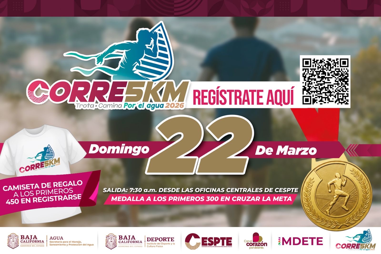 TECATE.- La Comisión Estatal de Servicios Públicos de Tecate (CESPTE) extiende una cordial invitación a toda la sociedad tecatense y a la comunidad atlética de la región para participar en la segunda edición de la carrera atlética «Corre 5km por el agua», la cual se llevará a cabo el próximo domingo 22 de marzo.