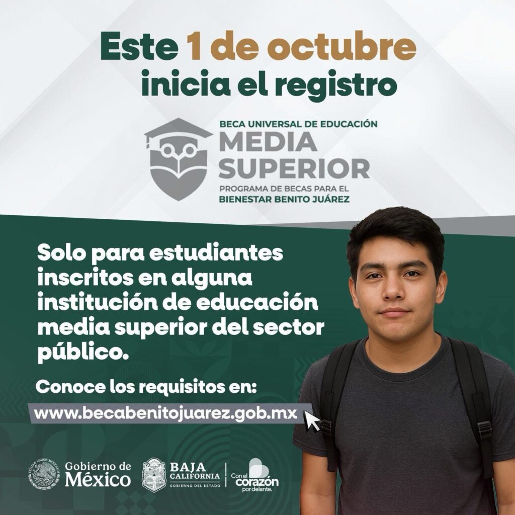 MEXICALI, B.C .– Estudiantes inscritos en preparatorias públicas de Baja California podrán aplicar a la Beca para el Bienestar Benito Juárez, cuya inscripción estará vigente del 1 al 15 de octubre, confirmó la gobernadora Marina del Pilar Avila Olmeda.